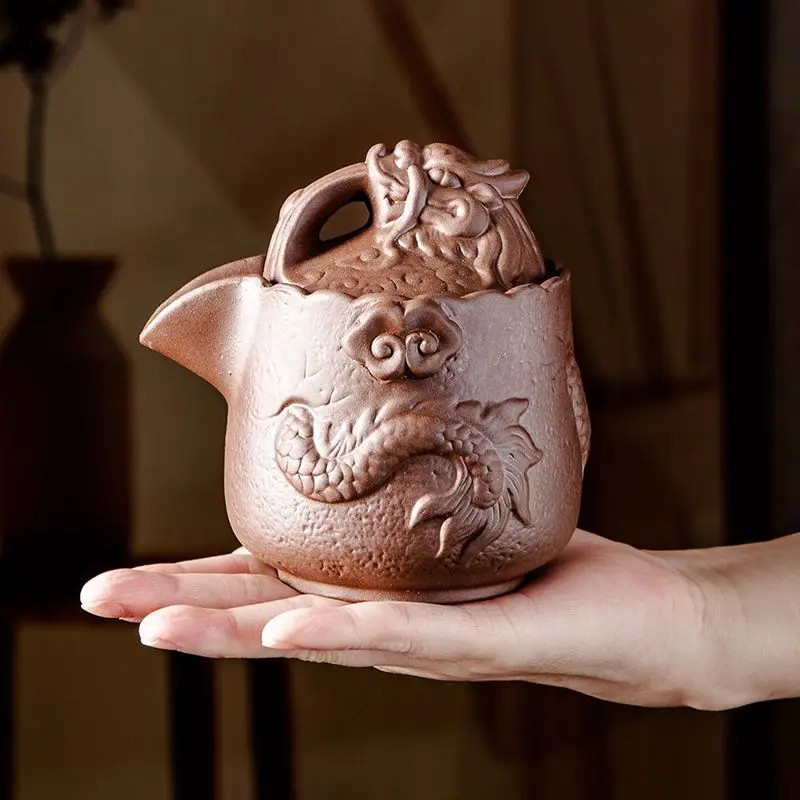Tetera de arcilla roja cruda y arena púrpura, juego de té hecho a mano con diseño de Dragón y Fénix, juego de té portátil, taza de uso doméstico, taza de té Gongfu, tetera Dragón