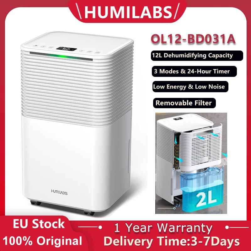 Deshumidificador Portátil HUMILABS OL12-BD031A, Capacidad de Deshumidificación de 12L, Filtro Extraíble, 3 Modos, Temporizador de 24 Horas, Bajo Nivel de Ruido, Bajo Consumo de Energía