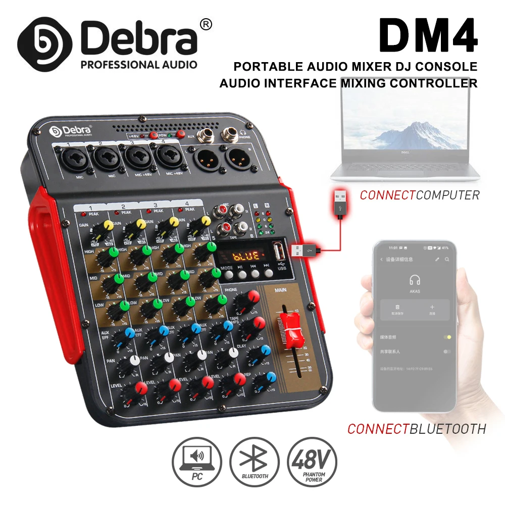 Mezclador de audio Debra de 6 canales con alimentación phantom de 48V, Bluetooth, grabación USB a PC, reproducción para karaoke en vivo, fiestas al aire libre