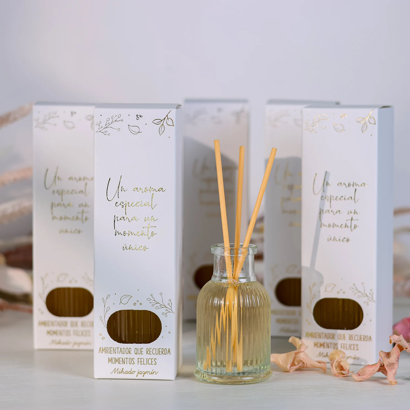 Pack 9-36 Ambientador Mikado Varillas Aroma Jazmín con Caja Decorativa, 40 ml, Detalles Boda Invitados Originales, Recuerdos Primera Comunión Invitados, Regalos Invitados Bautizo, Perfume Hogar Decoración Evento Boda Comunión, Regalantes Store