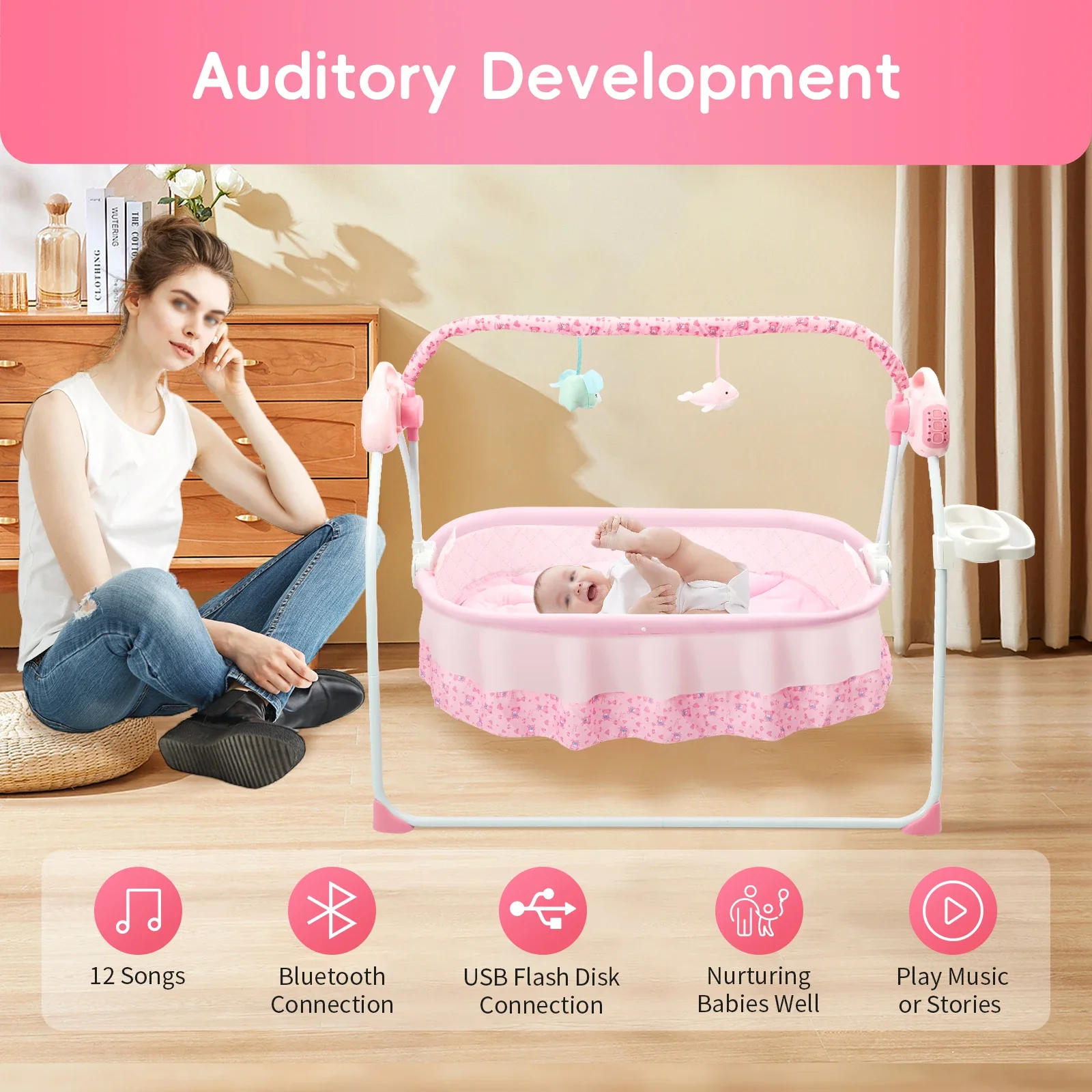 Cuna eléctrica para bebé de 0 a 18 meses, control remoto dual, Bluetooth, USB, 12 canciones, moisés plegable para bebé, capacidad de 25 kg/55 libras, rosa