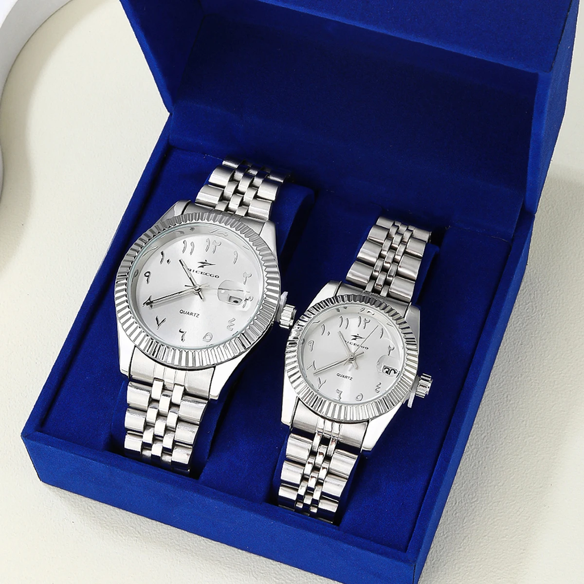 Reloj de pareja RICECGO, reloj de cuarzo con tira de acero inoxidable y escala de números arábigos plateados, puntero de luz nocturna, calendario, para hombre y mujer