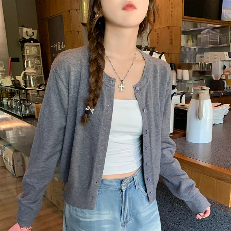 Cárdigan Coreano de Manga Larga, Delgado, Versátil, Informal, con Cuello Redondo, Protección Solar, Color Sólido, Cierre de un Solo Botón, Top Corto para Mujer