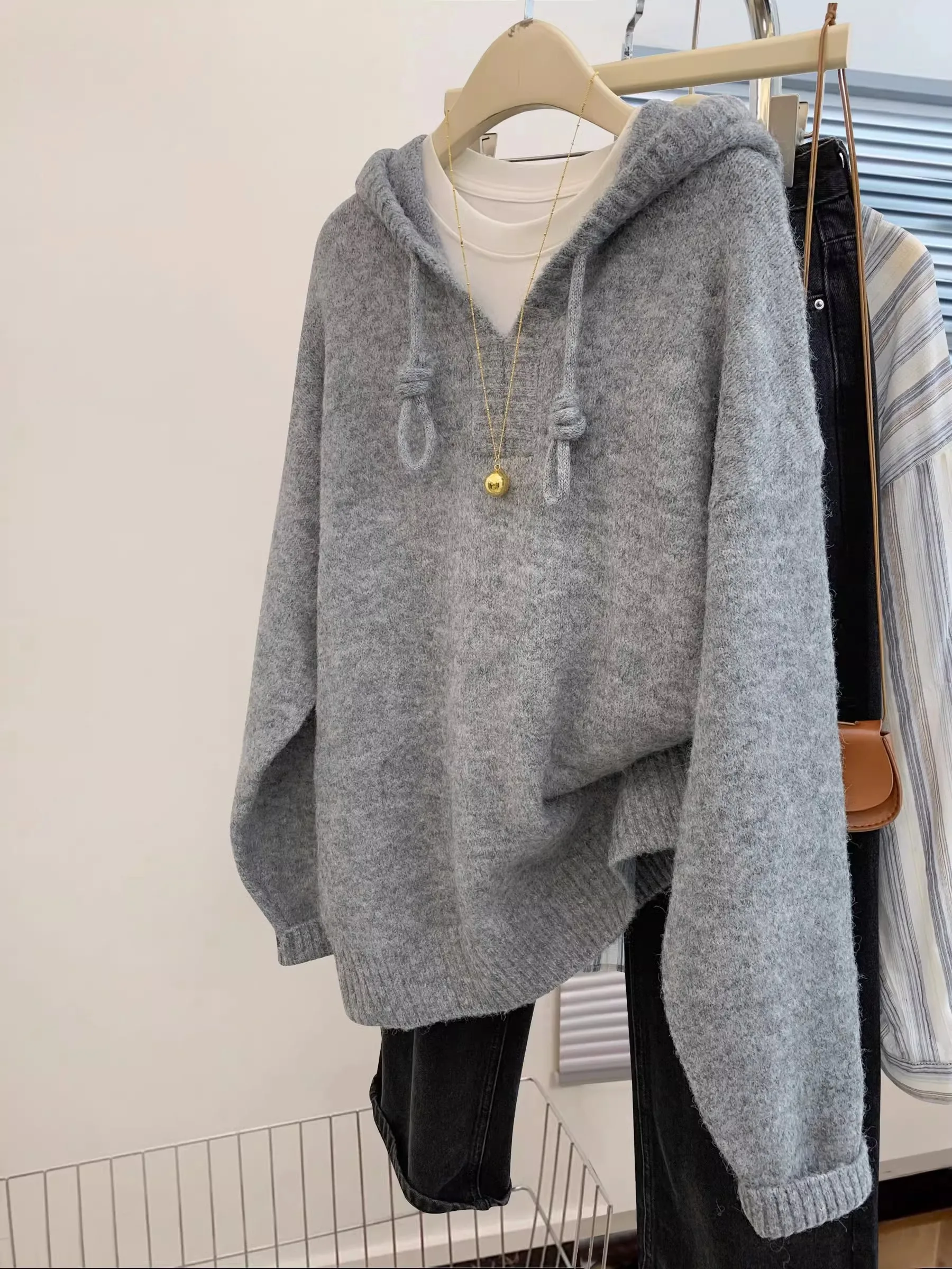Suéter con Capucha Gris para Mujer, Ropa de Abrigo Otoño Invierno, Estilo Holgado y Casual, Tejido de Punto, Manga Larga, Cál...