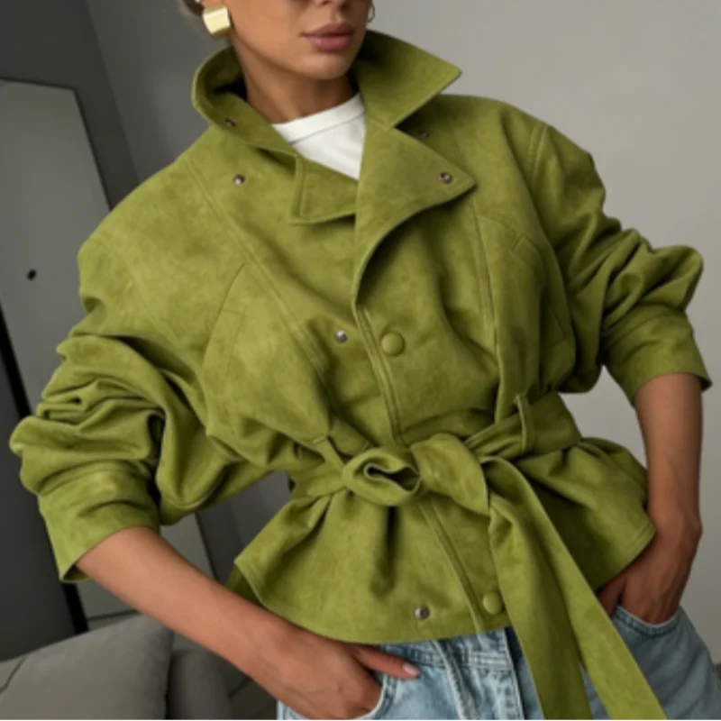Gabardina corta de mujer con cuello de solapa y cuello en V, estilo 2026, con cordones y cinturón, manga larga, botones, corte ajustado, cortavientos informal para la calle