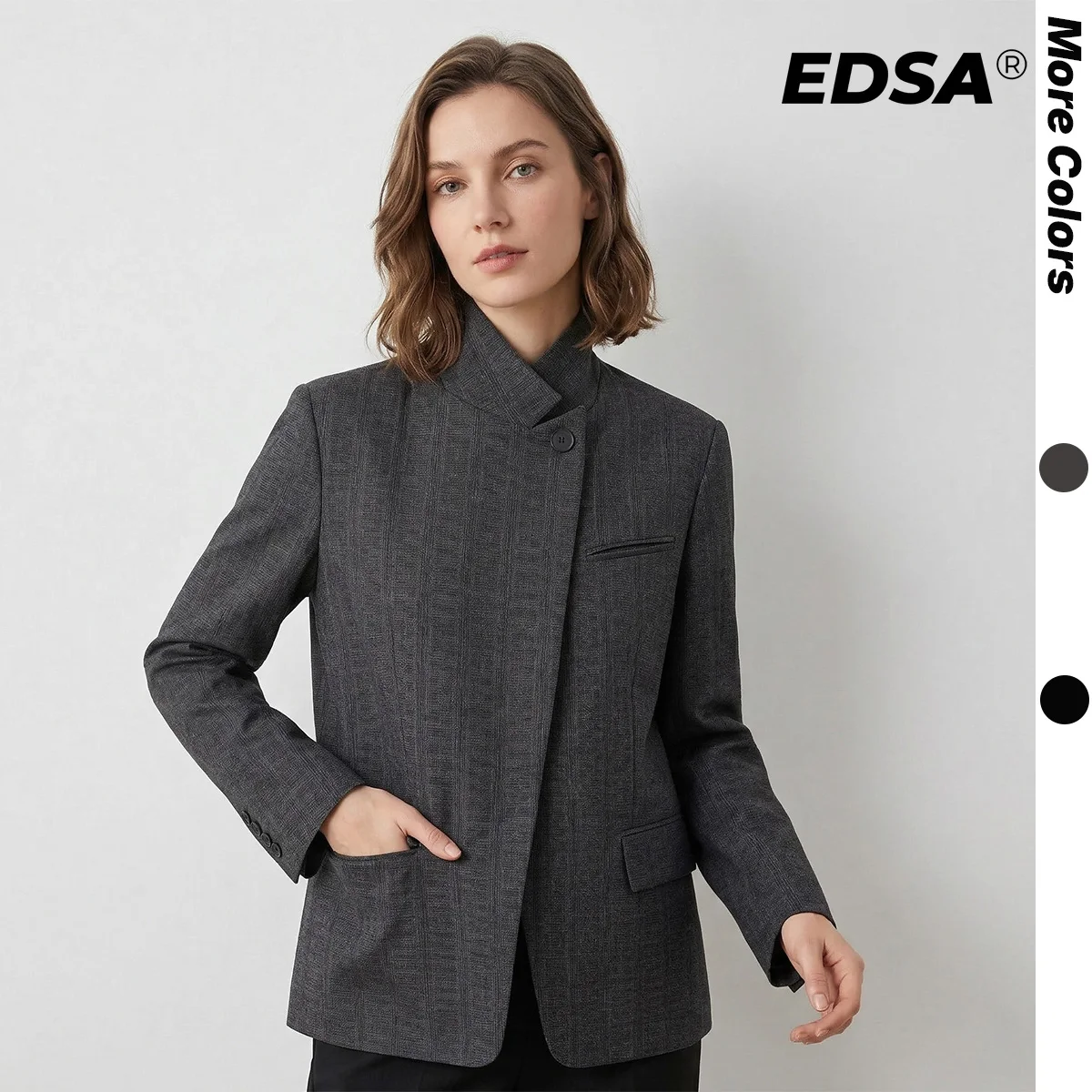 EDSA Blazer de mezcla de lana para mujer, chaqueta con un solo botón, mangas largas, cuello alto, bolsillos con solapa, abrigo para oficina, ropa exterior