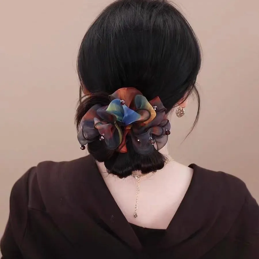 Elegante banda para el cabello de organza con pedrería, estampado floral, coletero para mujer, accesorios para el cabello, banda elástica de goma