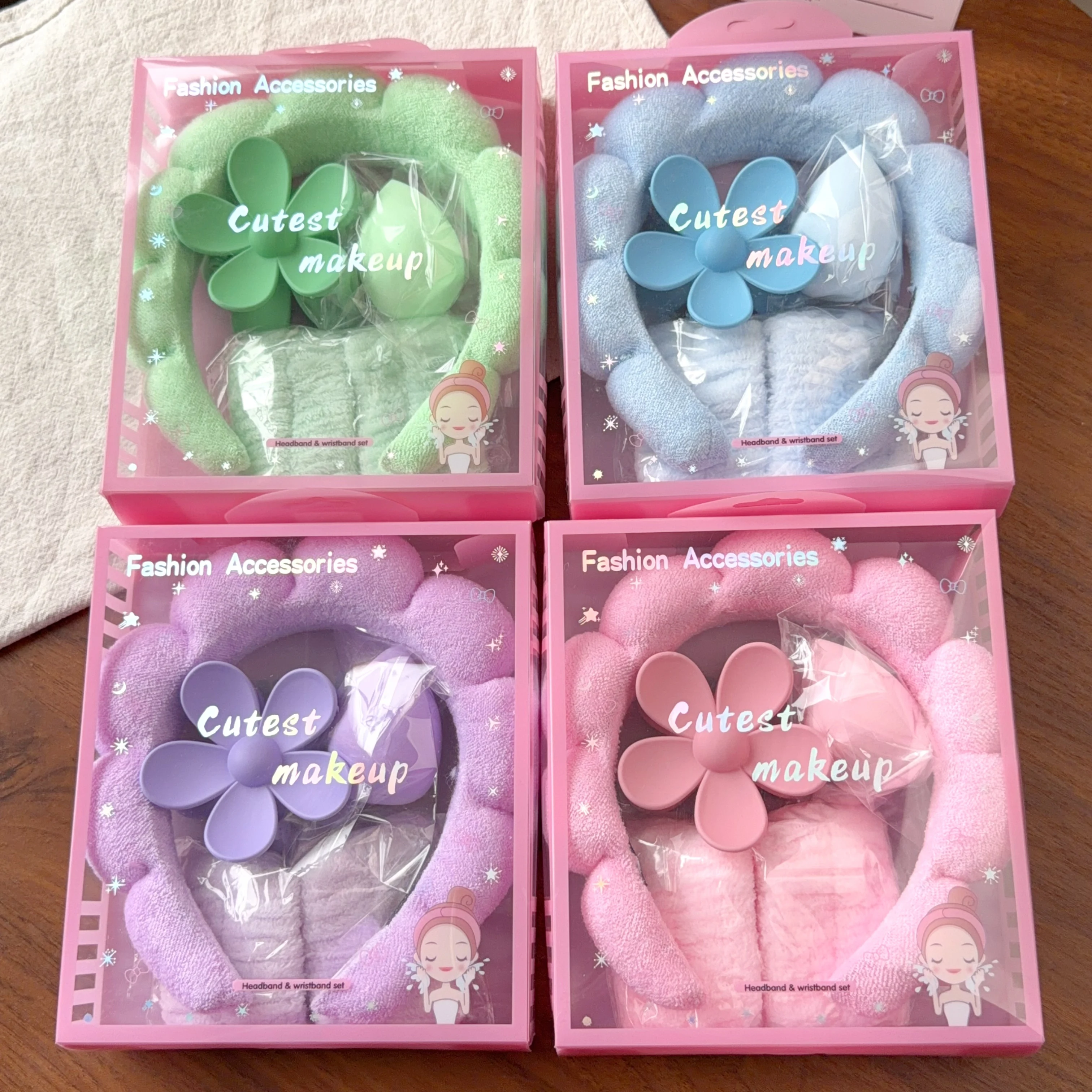 Set de cinco piezas en caja: pulsera de aseo, esponja, diadema con forma de nube, horquilla casual de corona alta para mujer