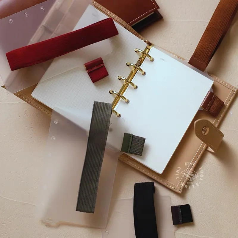 Cuaderno de hojas sueltas A7, soporte para bolígrafo, vendaje elástico, página interior, tablero de partición, carpeta DIY, accesorios decorativos y funcionales