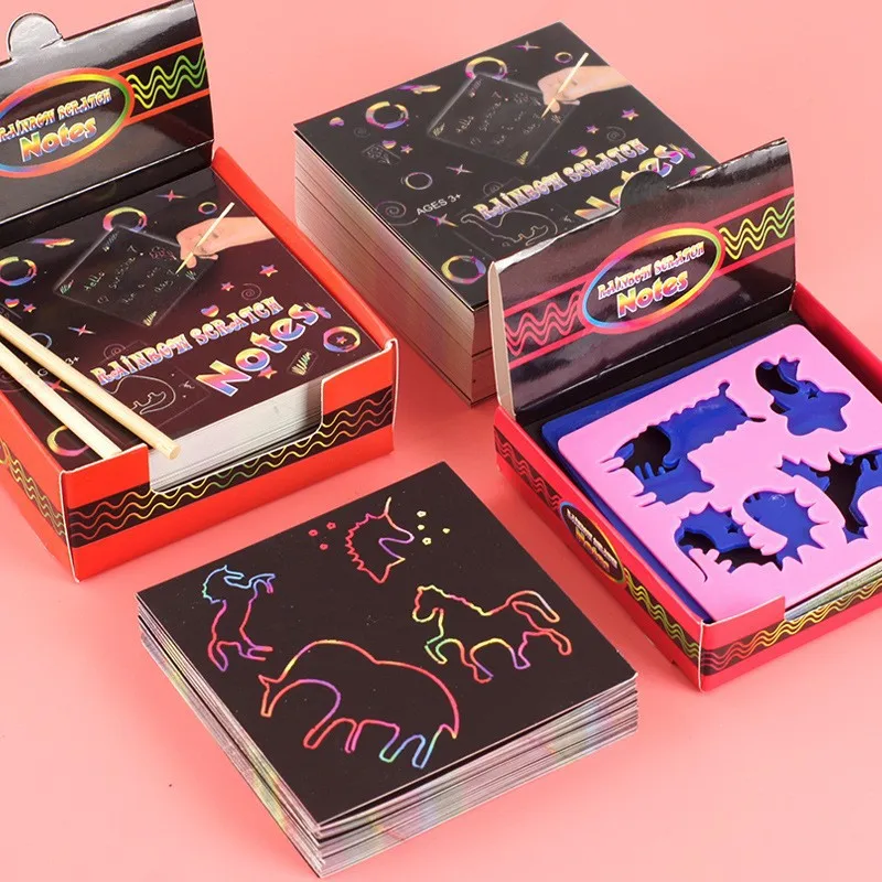 Papel rascar grueso en caja de 100 hojas con bolígrafo de bambú, garabatos y pintar para guardería, dibujo rasguño, bricolaje, adecuado para niños