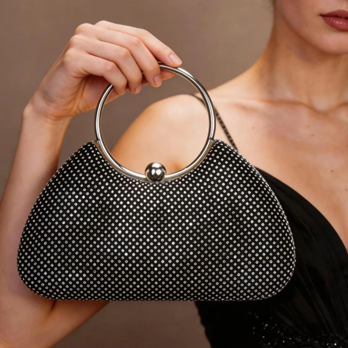 Bolso de noche 2026 de alta gama con lentejuelas y diamantes de imitación, bolso de mensajero tipo dumpling con anillo metálico para banquetes