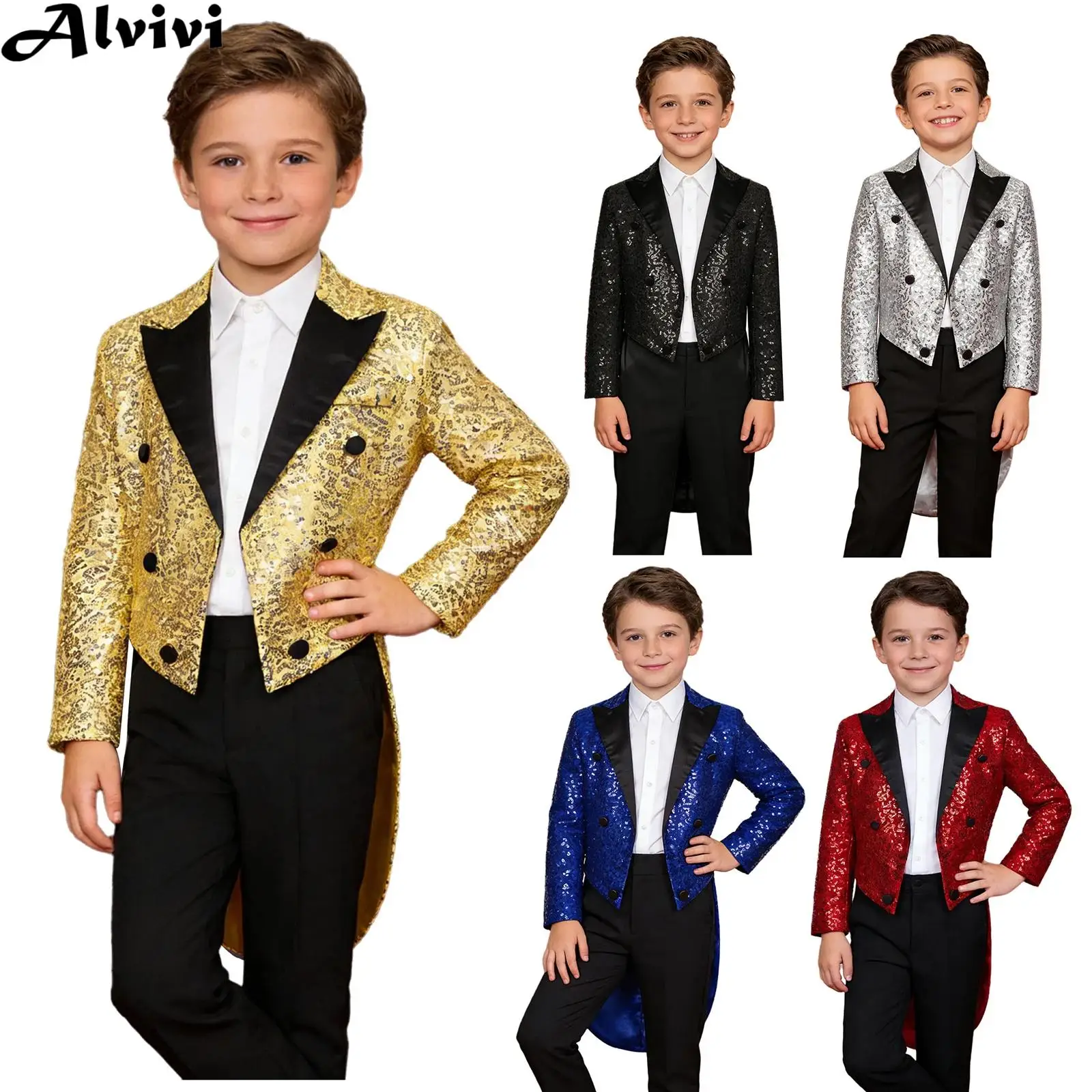 Chaqueta de satén con lentejuelas de manga larga para niños, esmoquin para fiesta de boda, abrigo de baile, disfraz de espectáculos mágicos de circo para Halloween y Carnaval