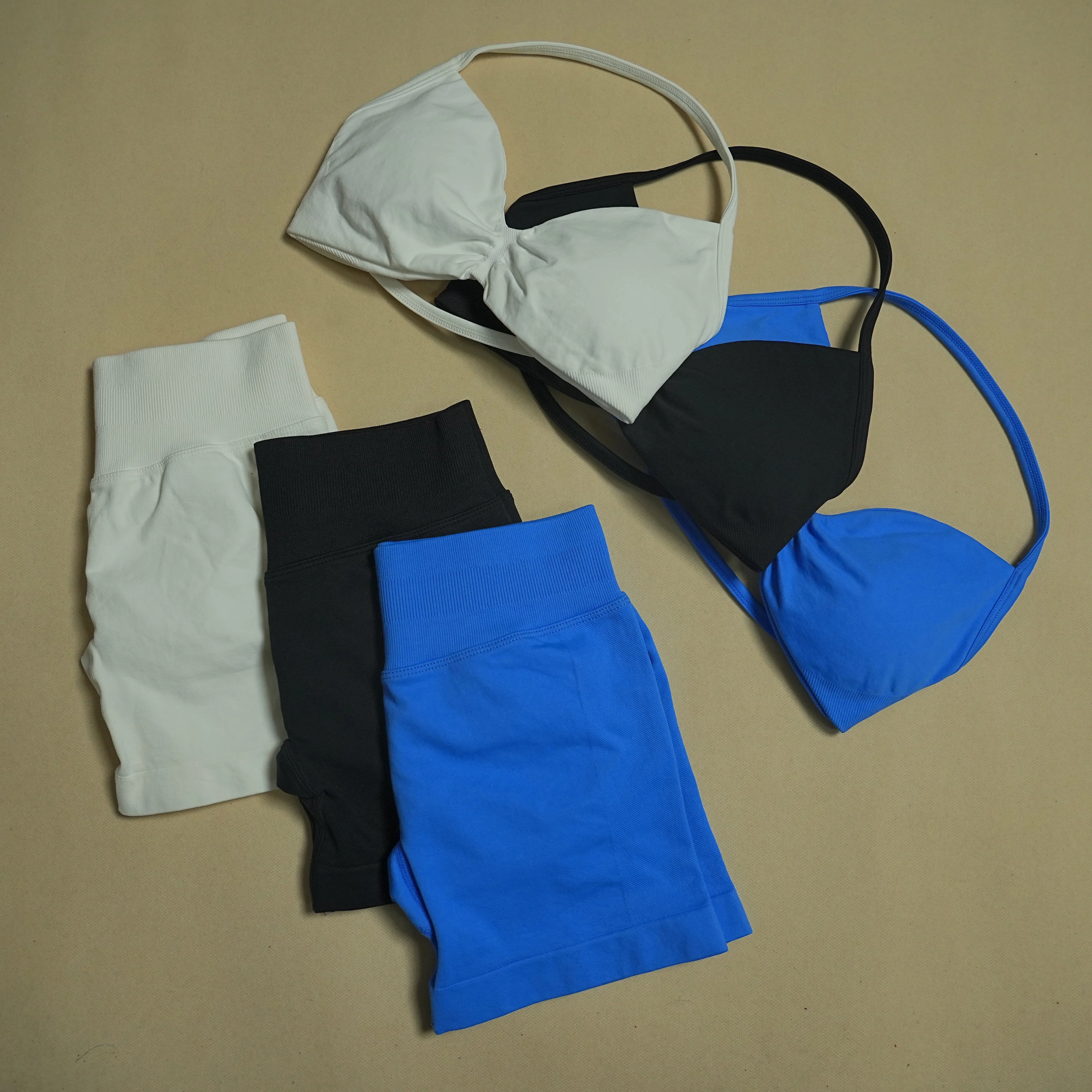 Conjunto de gimnasio y Yoga de 2 piezas para mujer, sujetador de Yoga con tiras sin costuras, Top de cintura alta, pantalones cortos de entrenamiento, conjunto deportivo, ropa deportiva