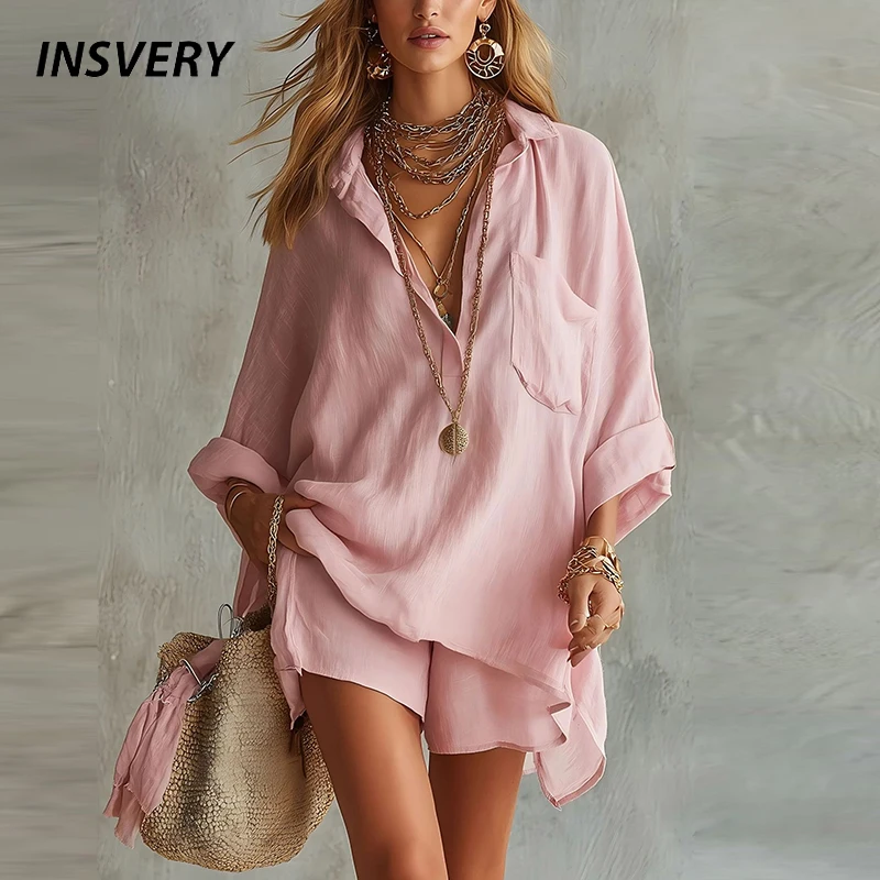 Conjunto de Dos Piezas Casual para Mujer, Primavera-Verano, Camisa de Manga Larga con Cuello en V, Blusa, Pantalones Cortos Holgados de Cintura Alta, Atuendos Femeninos Cómodos