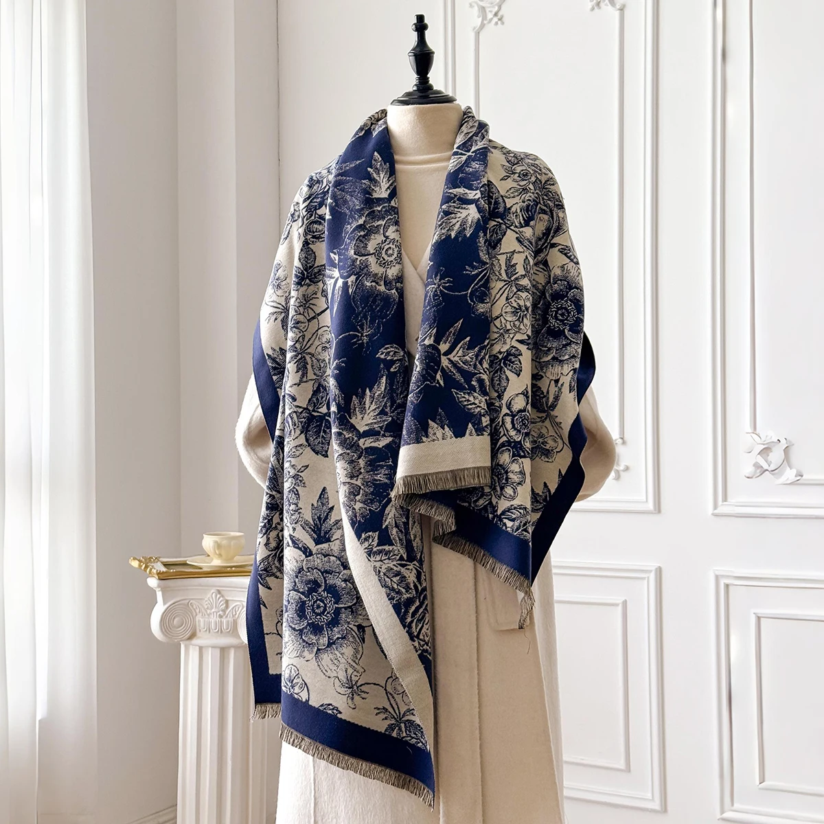 Elegante chal Pashmina de Jacquard Floral para mujer, bufanda de manta gruesa y cálida con diseño de borla de doble cara a prueba de frío y viento para invierno