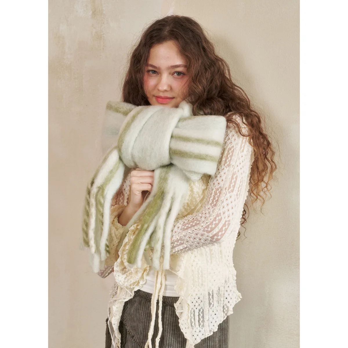 2025 nueva bufanda de lana a rayas verde manzana para mujer esencial para el invierno doble cara artesanía diferente chal largo grueso y cálido