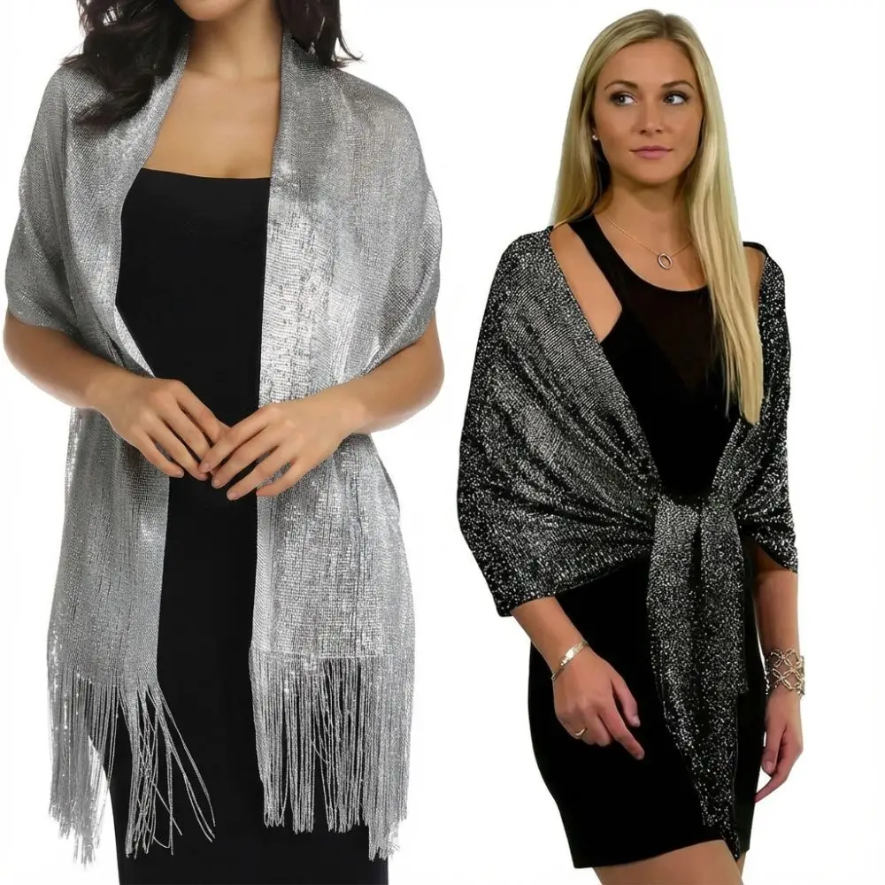 Bufanda metálica brillante de moda con hilo dorado y plateado Bufanda larga para vestido de noche de fiesta con chal para banquete con borlas