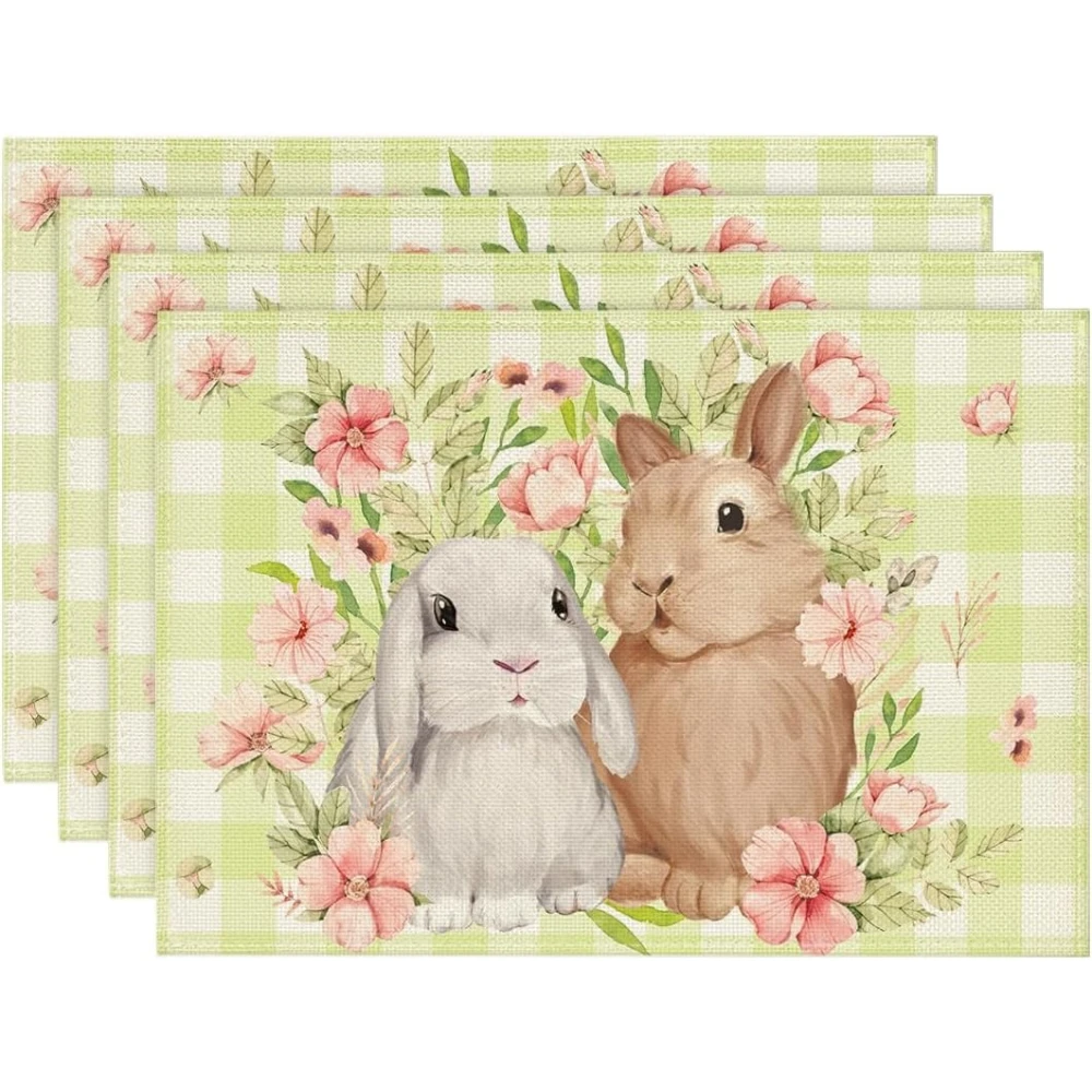 Manteles Individuales a cuadros de búfalo, conejito de Pascua, decoración de fiesta, hojas florales de primavera, manteles para mesa de comedor, manteles, decoraciones de Pascua