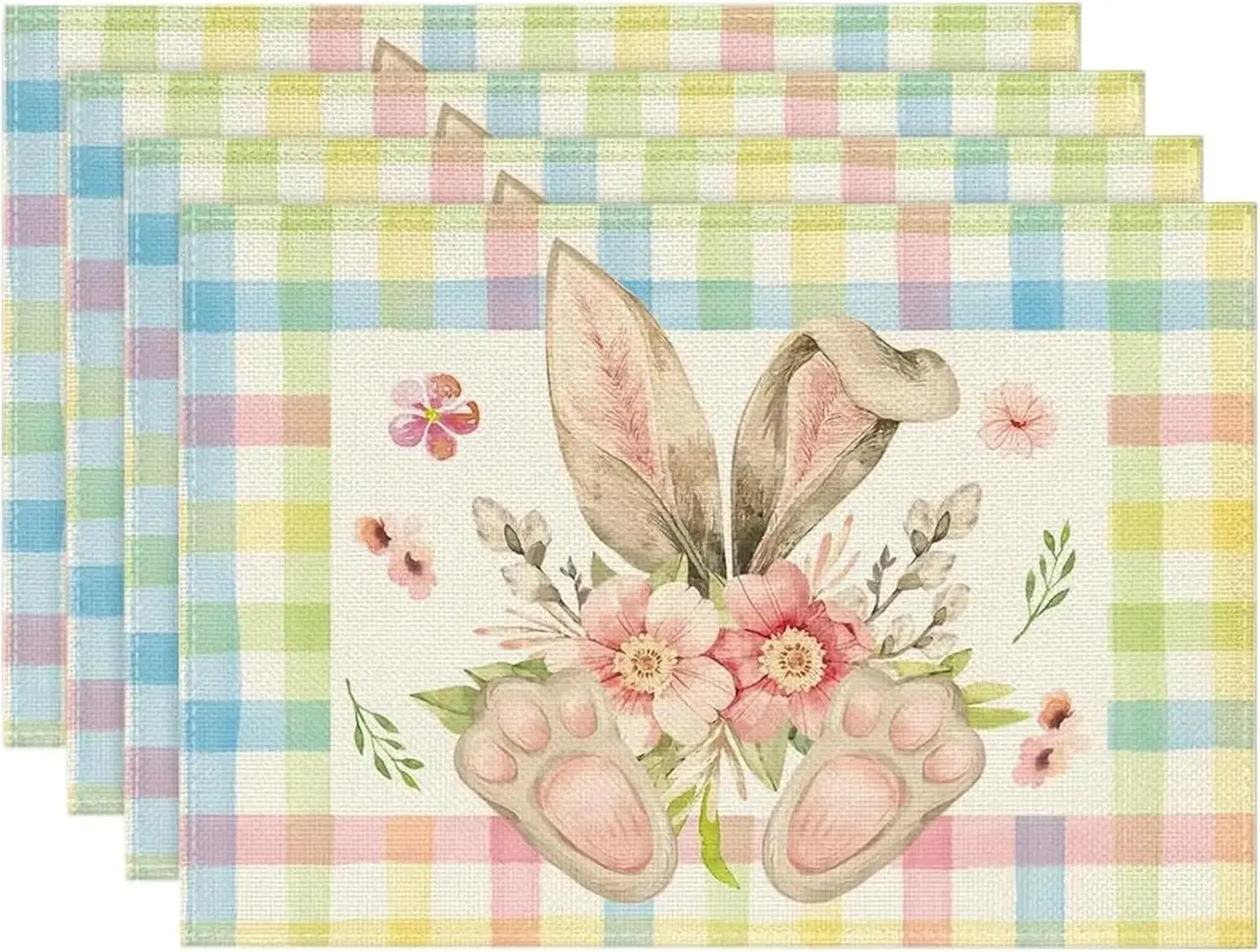 Manteles Individuales con huellas de Orejas de conejo de Pascua, decoración para fiestas navideñas, manteles de mesa a cuadros de búfalo Floral de acuarela de primavera, decoraciones de Pascua
