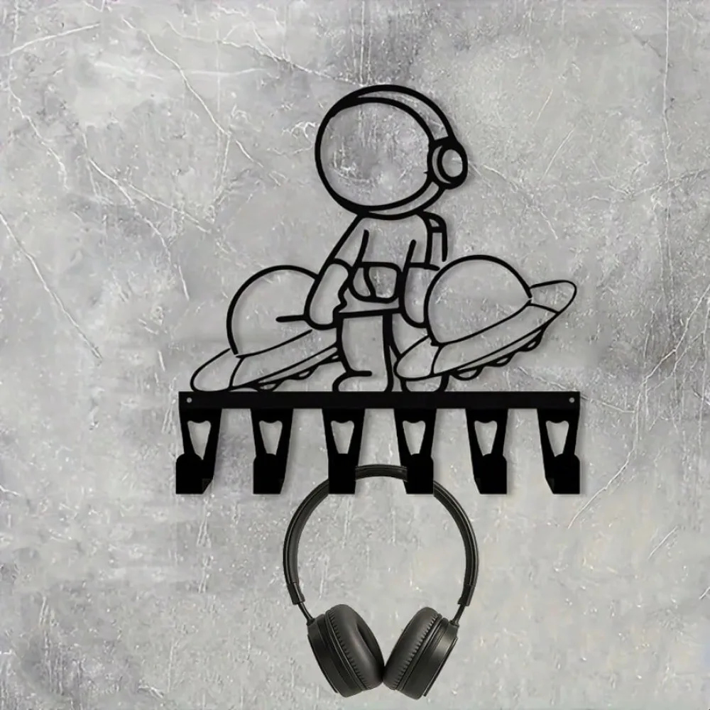 Porta Llaves Retro con Diseño de Astronauta y OVNI para Montar en la Pared - Organizador Metálico de Hierro con Temática Espacial de 6 Ganchos para Pasillo, Decoración de Habitaciones