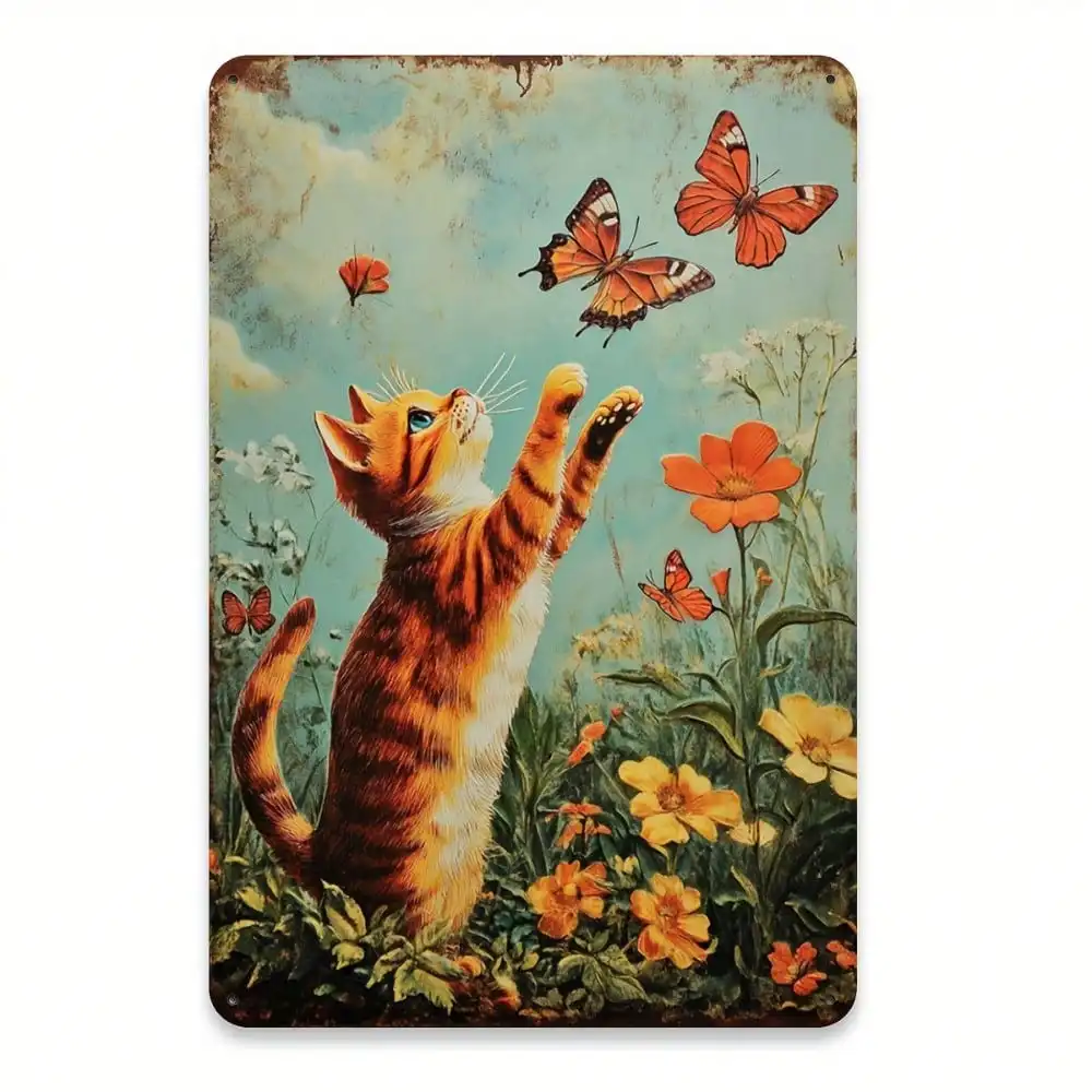 Letrero de metal retro con diseño de gato, 8x12 pulgadas, arte de pared con mariposas grabadas para decoración del hogar, bar, cafetería