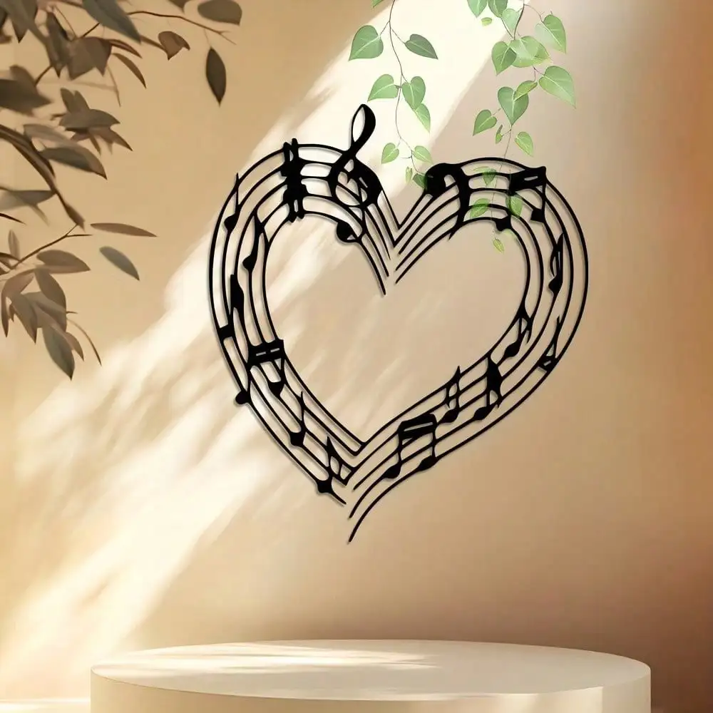 Arte de pared con forma de corazón y clave de sol de hierro, decoración metálica minimalista retro preperforada para sala de estar y dormitorio, negro/marrón