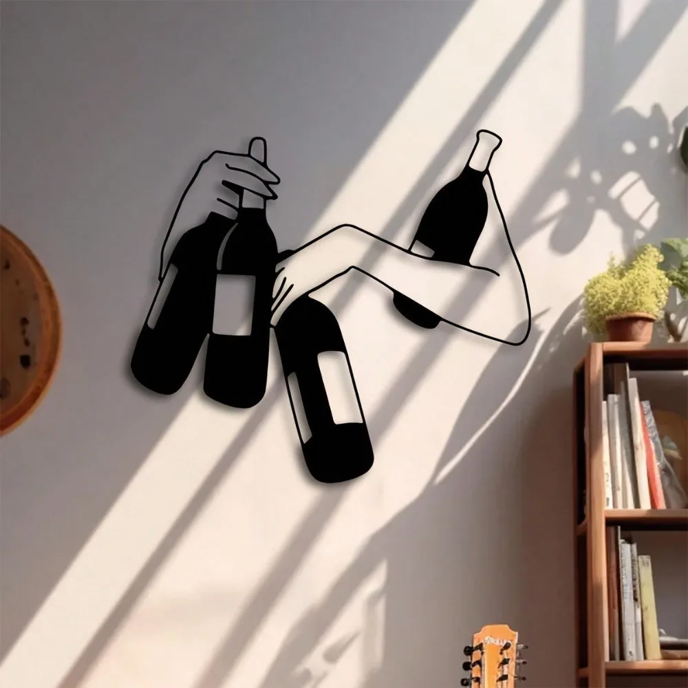Arte de pared de metal moderno de 15,7 x 13,8 pulgadas: silueta negra de botella para sujetar la mano | Decoración única para el hogar interior/exterior. Esculturas de pared