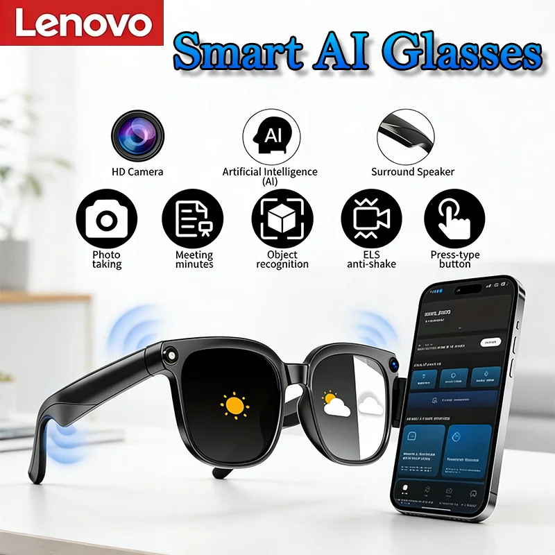 Gafas Inteligentes Lenovo 2026 con Cámara 4K HD, Asistente de Voz IA, Llamadas Bluetooth, Lentes con Cambio de Color, Fotografía de 100MP, Chat GPT