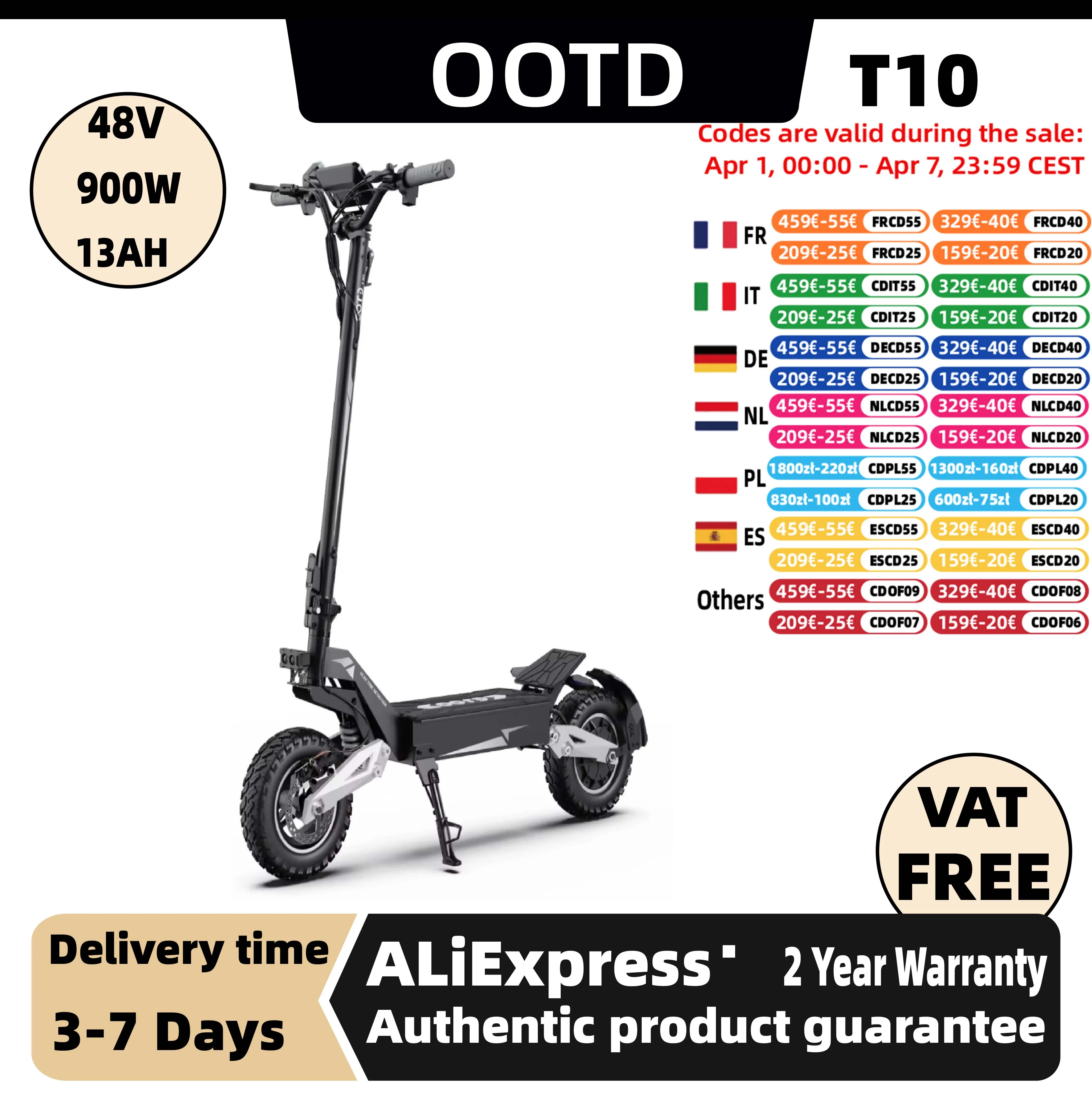 Scooter eléctrico OOTD T10 de 900W de potencia máxima, neumáticos de vacío, batería de litio de 48V y 13Ah, duración de batería extremadamente larga.