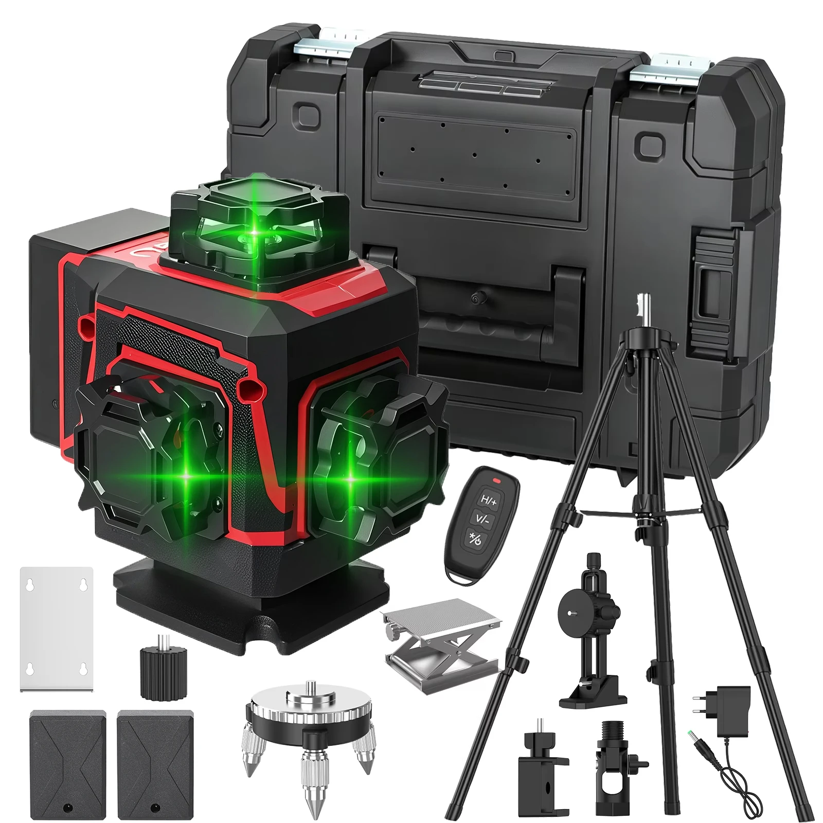 4D 16 Líneas 360 ° Niveles Láser Autonivelantes con Trípode, Herramienta de Nivelación Láser Profesional, Nivel Láser de Haz Verde de Alta Potencia con Batería de 2400