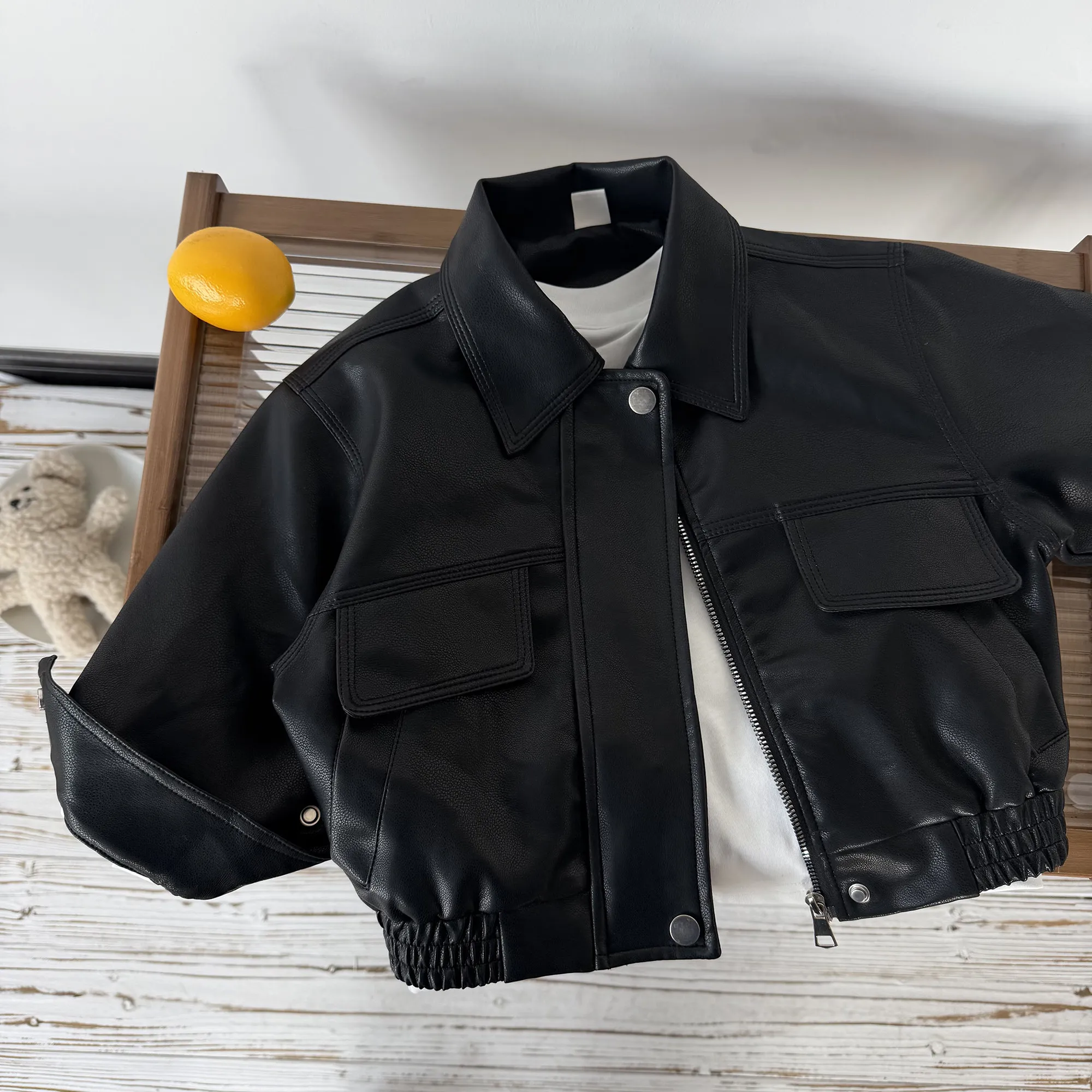 Chaqueta de Cuero para Niños, Estilo Motocicta, Primavera-Otoño, Versión Coreana, Chaqueta de PU con Cierre