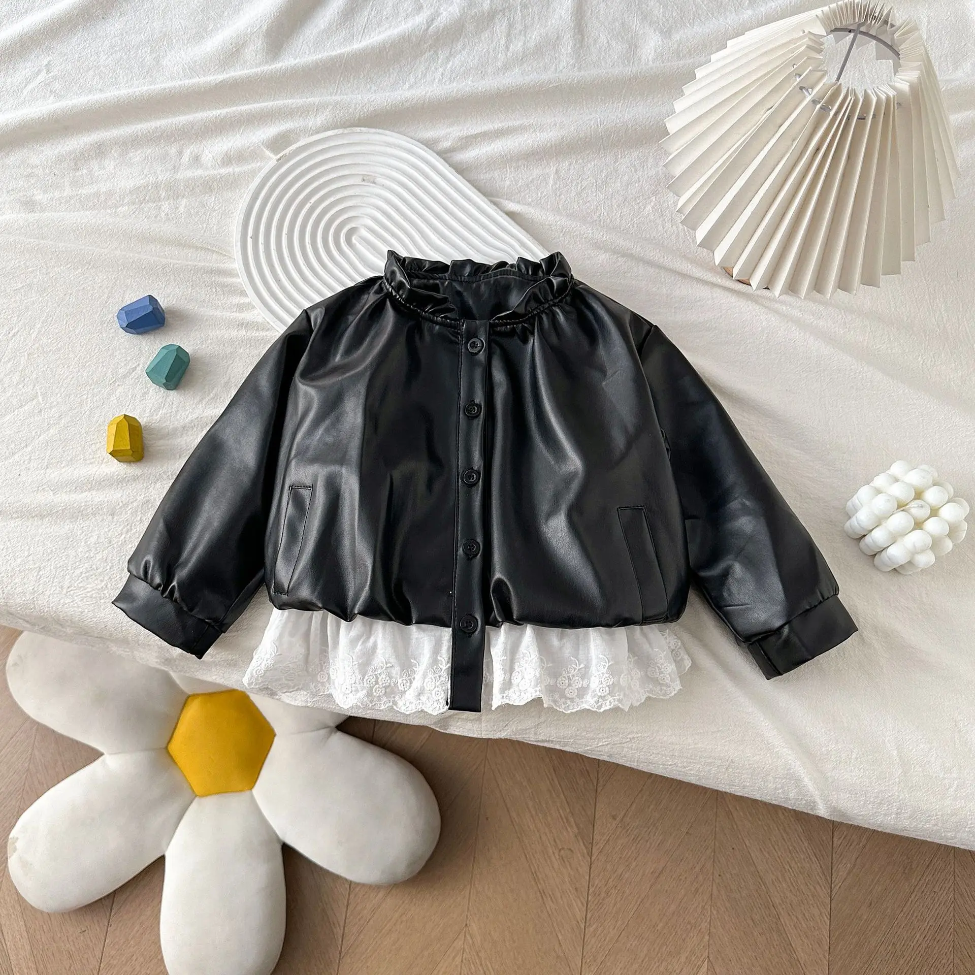 Chaqueta Corta de Niña con Parches, Estilo Coreano, para Otoño, con Ribete de Encaje, Chaqueta de Cuero, Ropa Infantil