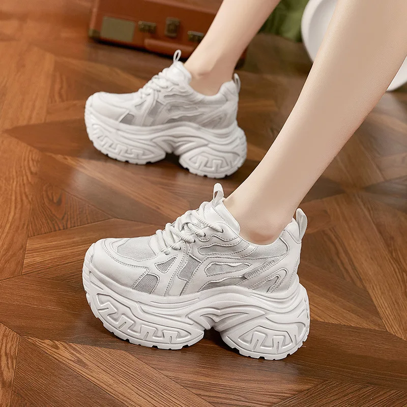 Botas altas de suela gruesa para mujer, botas de cuero cómodas con diamantes de imitación, informales, a la moda, con aumento de altura de 10CM, otoño