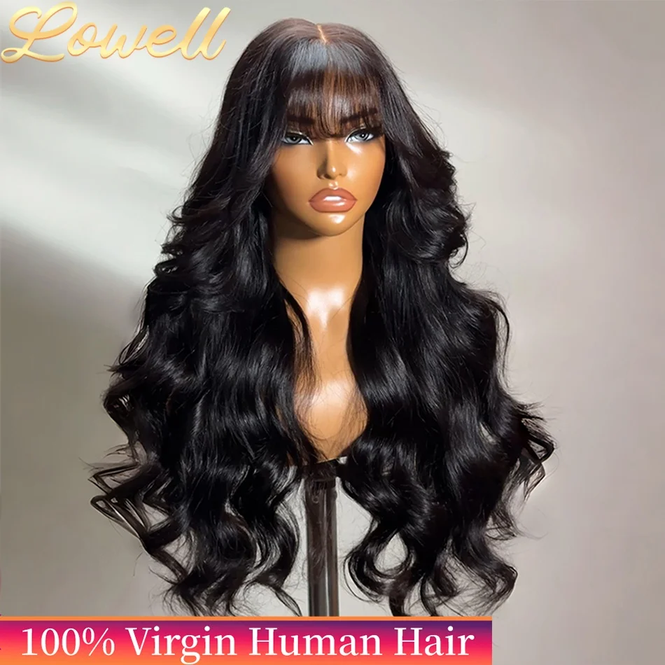 Pelucas de Cabello Humano con Ondas Corporales de 220 de Densidad con Flequillo, 30 Pulgadas, Pelucas Brasileñas de Encaje 3x1 para Mujer, Pelucas sin Pegamento, Cabello Humano de Aspecto Natural