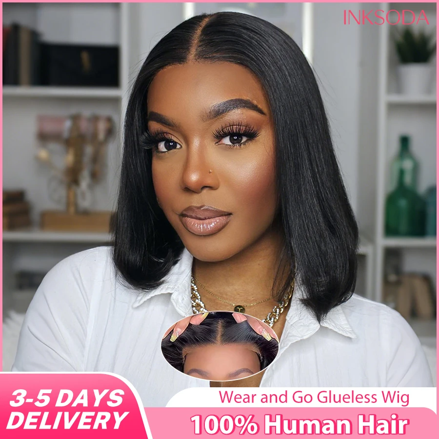 Pelucas Cortas de Cabello Humano Liso sin Pegamento, con Frente de Encaje Transparente HD 5x5, Peluca de Cabello Humano 100% Natural