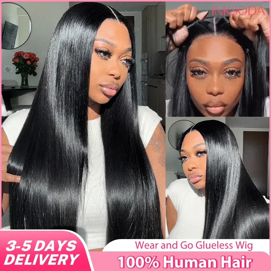 Peluca frontal de encaje sin pegamento, lista para usar, cabello humano liso, pre-arrancada, pelucas de cabello humano brasileño para mujer, encaje precortado