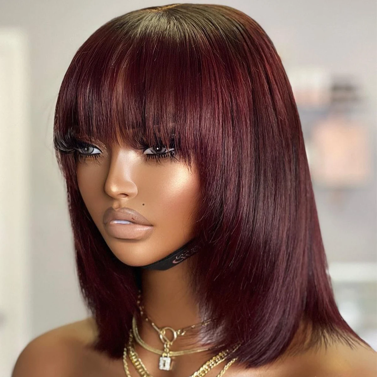 Peluca Bob Corta con Flequillo, Cabello Humano Liso, Densidad 400, Peluca Bob 99j para Mujer