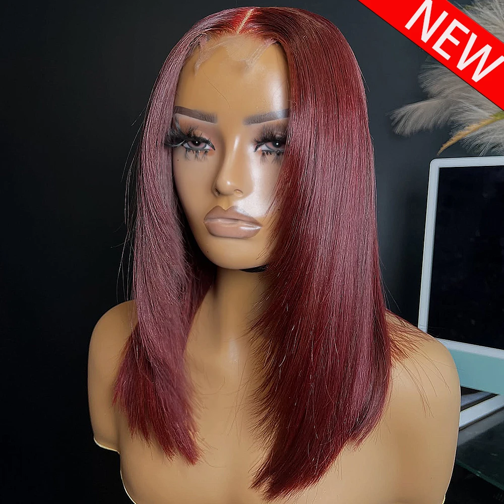 # Peluca de Cabello Humano 99J Borgoña, Lisa, en Capas, sin Pegamento, de 14 Pulgadas, con Frente de Encaje Transparente HD 13x6, Densidad 400, Pre-Depilada