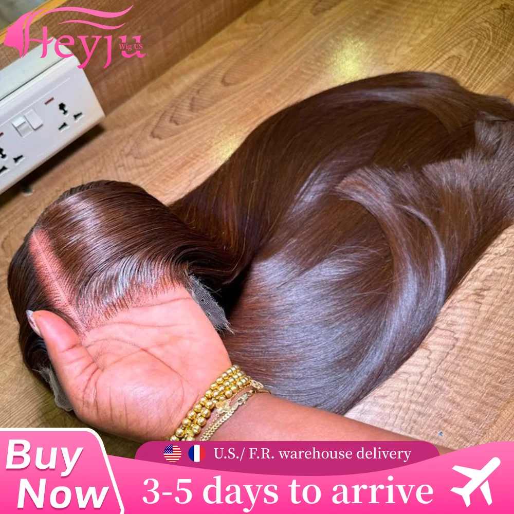 Pelucas Heyju de Cabello Humano Brasileño Remy, Color Marrón Chocolate, Lisas, con Frente de Encaje Transparente 13x6, Pre-Desplumadas, 13x4