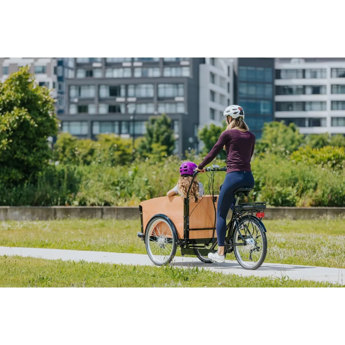 Bicicleta de Carga de 3 Ruedas con Asistencia Eléctrica y Dirección Trasera, Caja de Madera para Mascotas, Paseo con Niños, Carga Familiar y Pasajeros