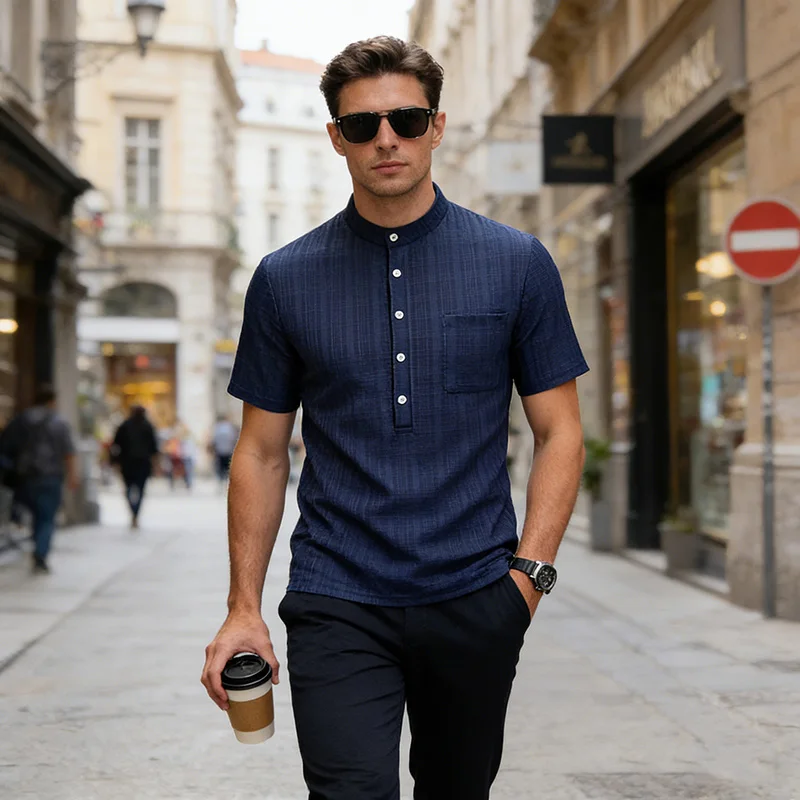 Polo Henley de Algodón para Hombre, Sin Cuello, Azul, Manga Corta, Corte Ajustado, con Botones, Transpirable, para Verano