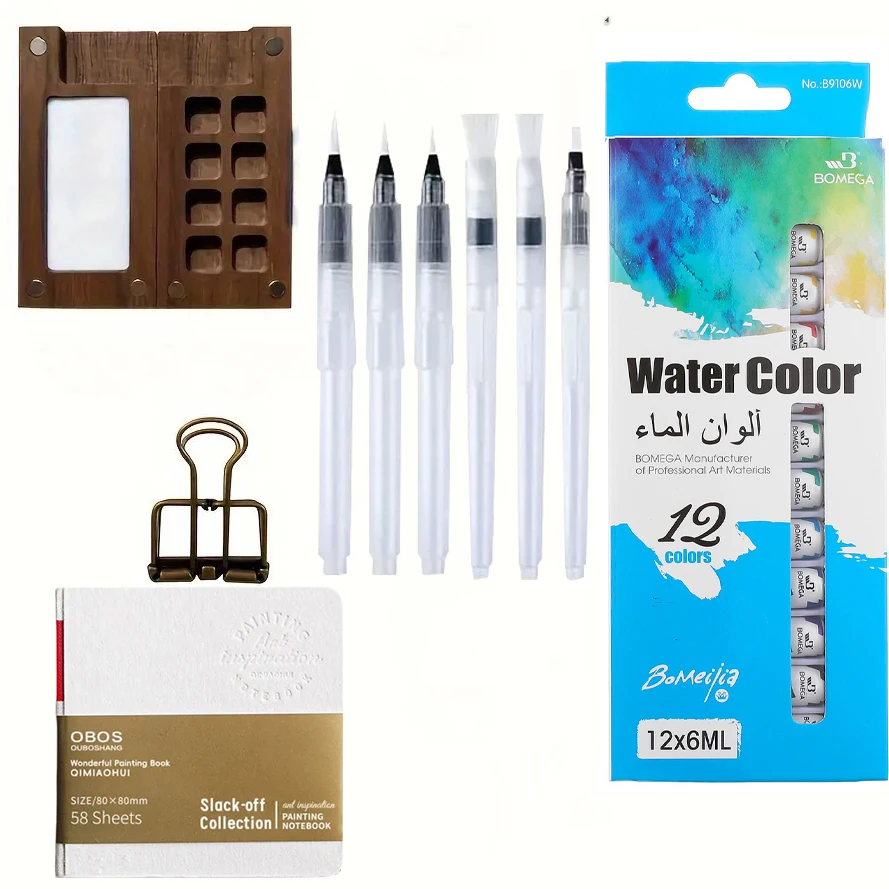Juego de paleta de acuarela con caja de pintura de madera, mini paleta de pintura de viaje con clips de carpeta, juego de pintura de acuarela para amantes del arte