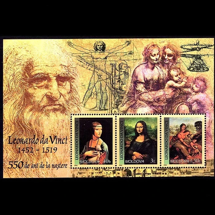 1 Hoja de Sellos Postales de Moldavia Nuevos de 2002, Pintura de Da Vinci, Souvenir de la Mona Lisa, Sellos en Estado Nuevo