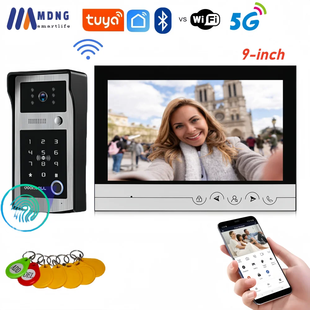 Sistema de Videoportero WIFI Tuya de 9 Pulgadas, Cámara de Timbre Inalámbrica HD 1080P Resistente al Agua con Teclado de Contraseña y Tarjeta RFID