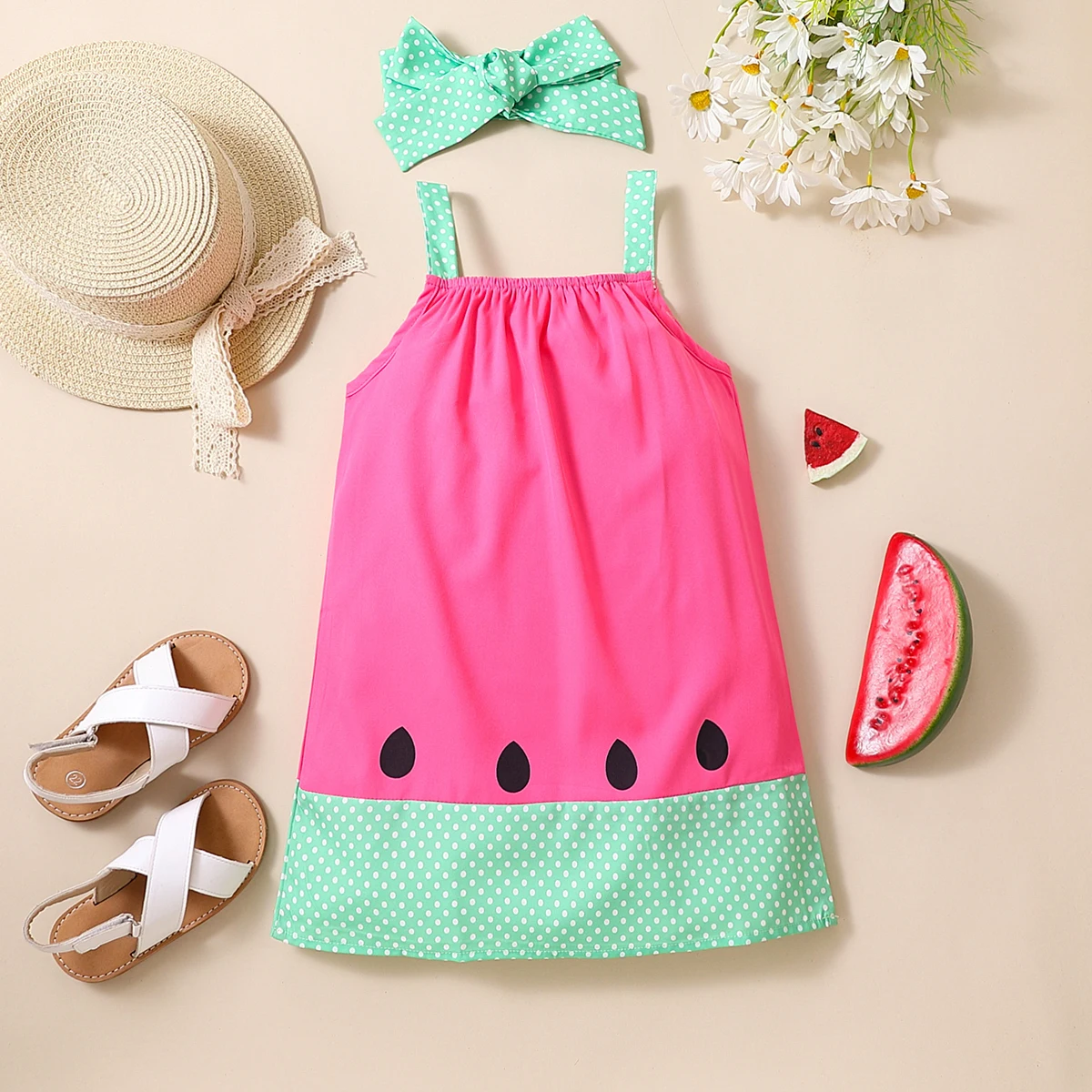 Vestido de Verano para Niña con Estampado de Sandía, Falda con Lunares Color Menta, Diadema a Juego, Vestido Rojo con Decoración de Semillas Negras
