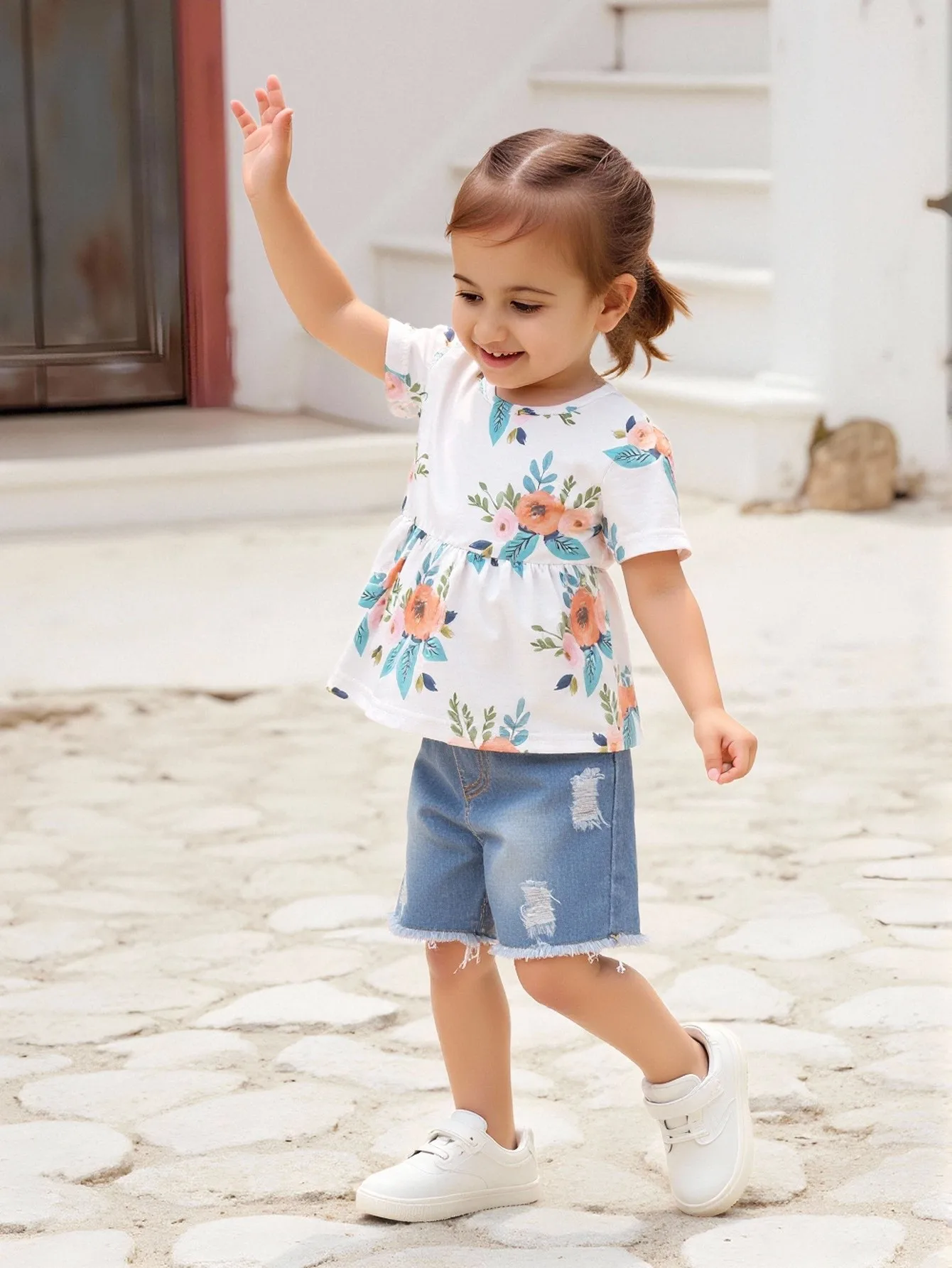 Conjunto de dos piezas de verano para niña, top de cuello redondo de manga corta con estampado de hojas verdes y flores a la moda, pantalones cortos desgastados de mezclilla