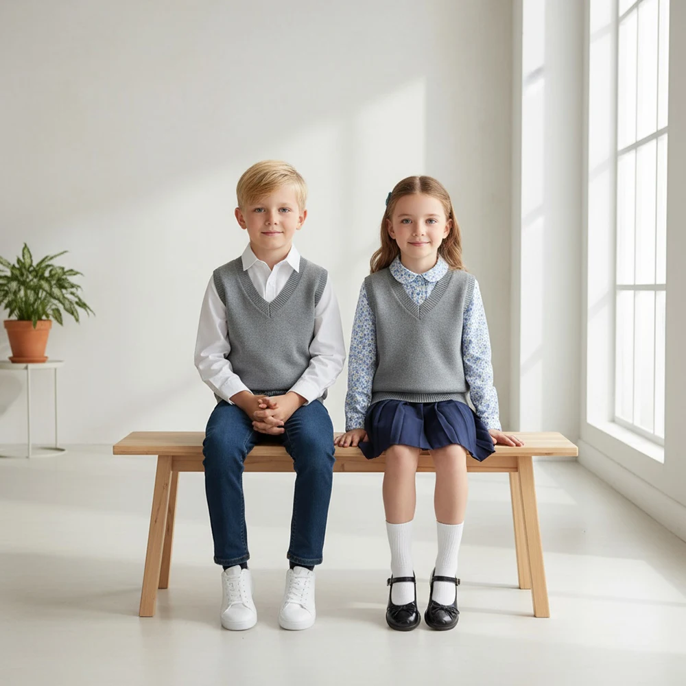 Chaleco tejido para niños y niñas, suéter de otoño e invierno, Color sólido, estilo Preppy, chaleco con cuello en V, jerséis sin mangas, gris, azul real