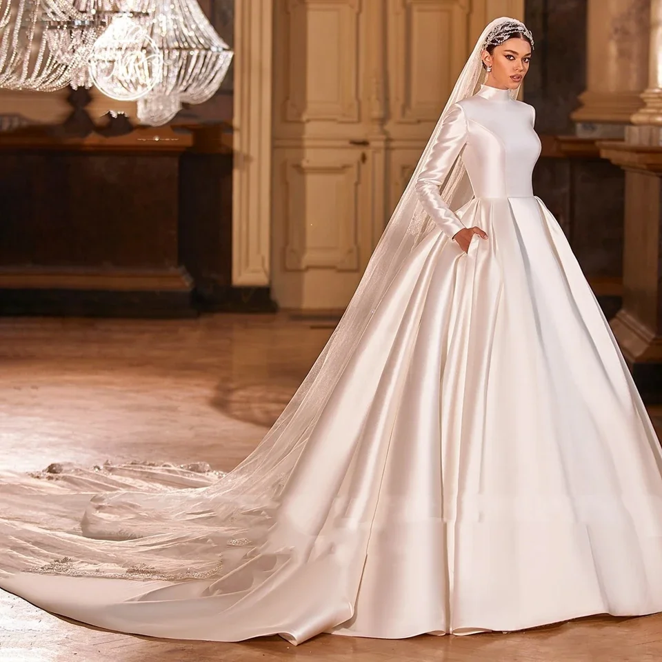 Elegante vestido de novia de satén con cuello alto, vestido de noche de manga larga para fiesta, falda hasta el suelo con corte en A, vestido de novia personalizado