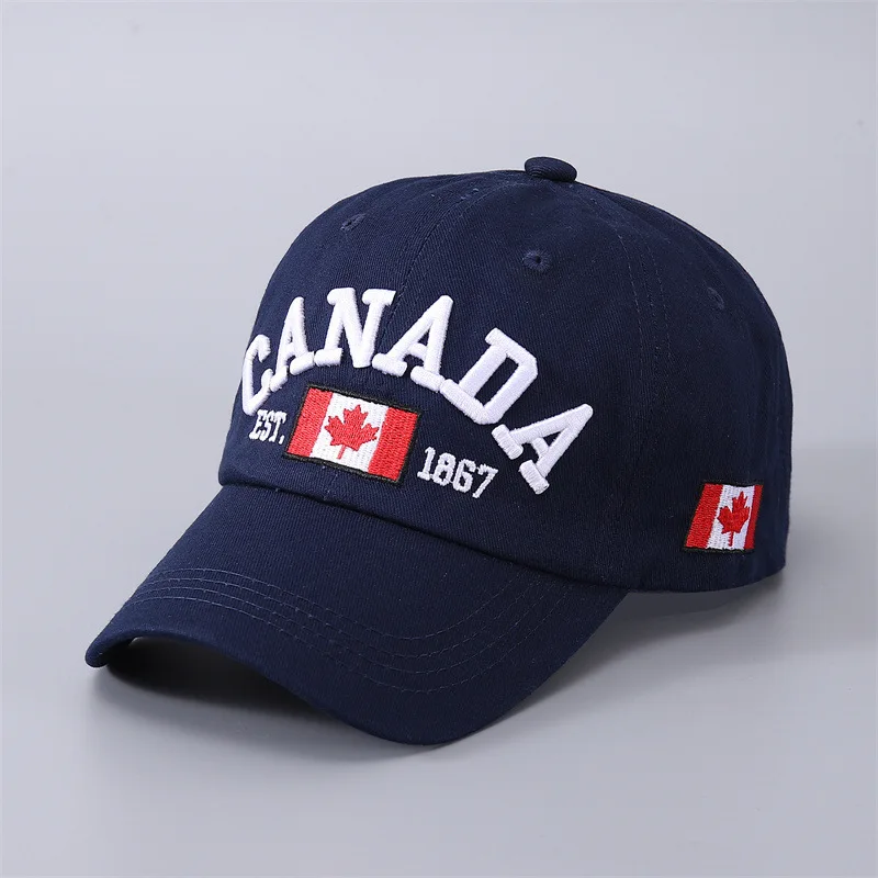 Gorra de béisbol personalizada con letras en stock para envío transfronterizo a Canadá, gorra de béisbol de algodón puro con hoja de arce canadiense, moderna