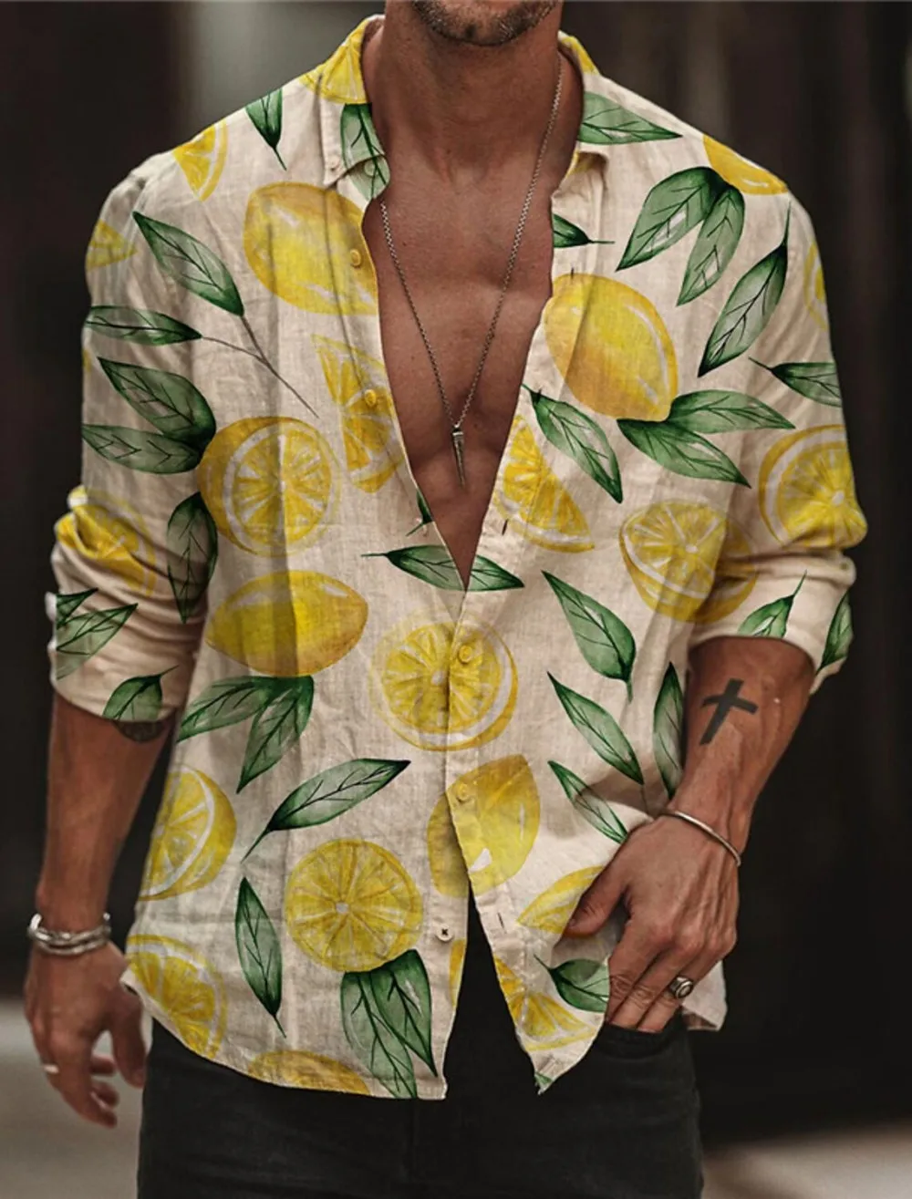 Camisa de Limón para Hombre, Camisa Hawaiana de Verano, Camisa de Manga Larga, Estilo Deportivo, Moda Urbana, Estilo Casual, para Uso Diario al Aire Libre